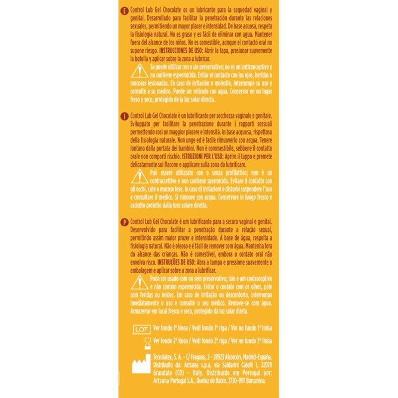 Control Lub Gel Chocolate é um lubrificante para ressecamento vaginal e genital com agradável efeito aquecedor desenvolvido para facilitar a penetração durante as relações sexuais, permitindo maior prazer e intensidade. À base de água, respeita a fisiologia natural. Não é gorduroso e é fácil de remover com água